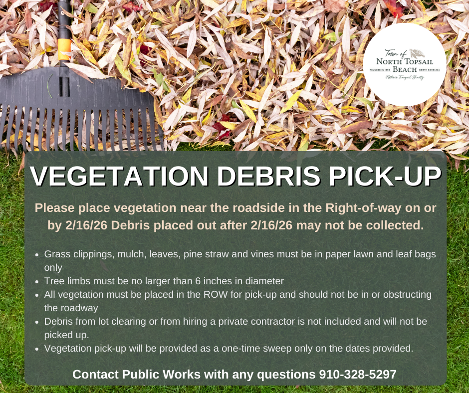 Please place vegetation near the roadside in the Right-of-way for scheduled pick-up by February 16th. Debris placed out after February 16th may not be collected.